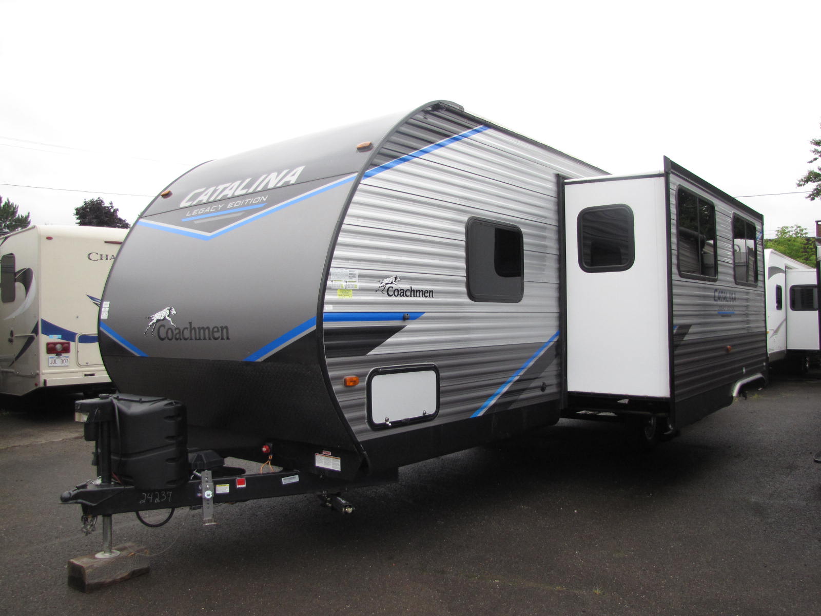 THIS FAMILY CAMPER IS THE CATALINA LEGACY EDITION MADE BY COACHMEN WITH A U.V.W. OF 6883 POUNDS. ONE SLIDE OUT, POWER TONGUE JACK, REAR MOUNTED CARRIER, ENCLOSED UNDERBELLY AND A POWER AWNING WITH REMOTE CONTROLLED MULTI COLOURED LED LIGHTS. THE OUTSIDE KITCHEN HOLDS A PROPANE GRIDDLE, A SINGLE DOOR FRIDGE/FREEZER AND STORAGE. INSIDE STILL SMELLS NEW! MINIMAL CARPETING, FABRIC WINDOW TREATMENTS AND A FIREPLACE IN THE ENTERTAINMENT CENTRE. THE FULLY EQUIPPED KITCHEN HAS STAINLESS STEEL APPLIANCES AND QUALITY SOLID SURFACE COUNTER TOPS. WILL SLEEP UP TO ELEVEN PEOPLE WITH FOLD DOWN THEATRE SEATS, A FOLD DOWN DINETTE AND THE UP FRONT QUEEN BEDROOM. THE REAR BUNK HOUSE HAS THREE BUNKS, A FOLD OUT CATALINA COUCH AND STORAGE. IN THE ENSUITE IS A DOUBLE SHOWER AND LINEN STORAGE. COME SEE THIS GORGEOUS CAMPER AND CALL RV PETE FOR MORE DETAILS AT 506-260-2666. EASY TERM FINANCING OPTIONS AVAILABLE, O.A.C. WE ARE OPEN EVERYDAY!!!