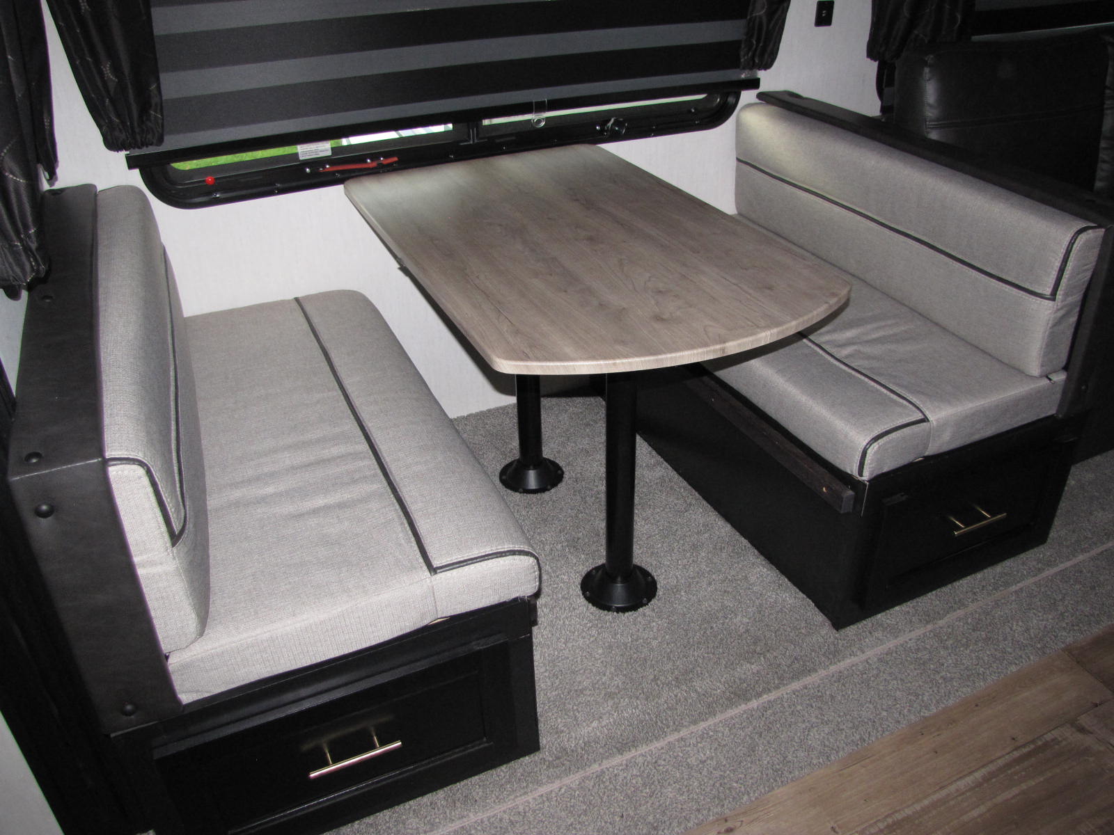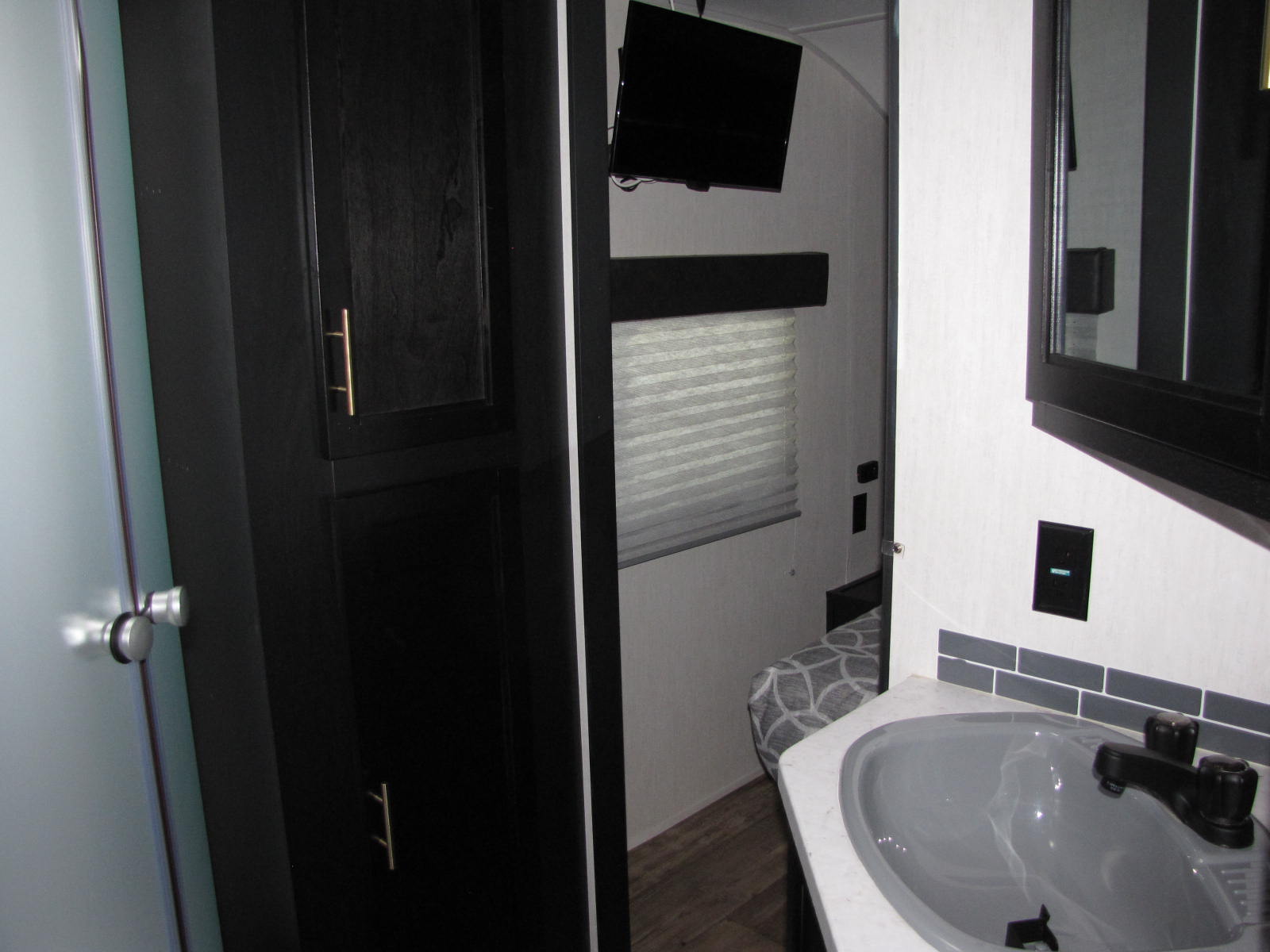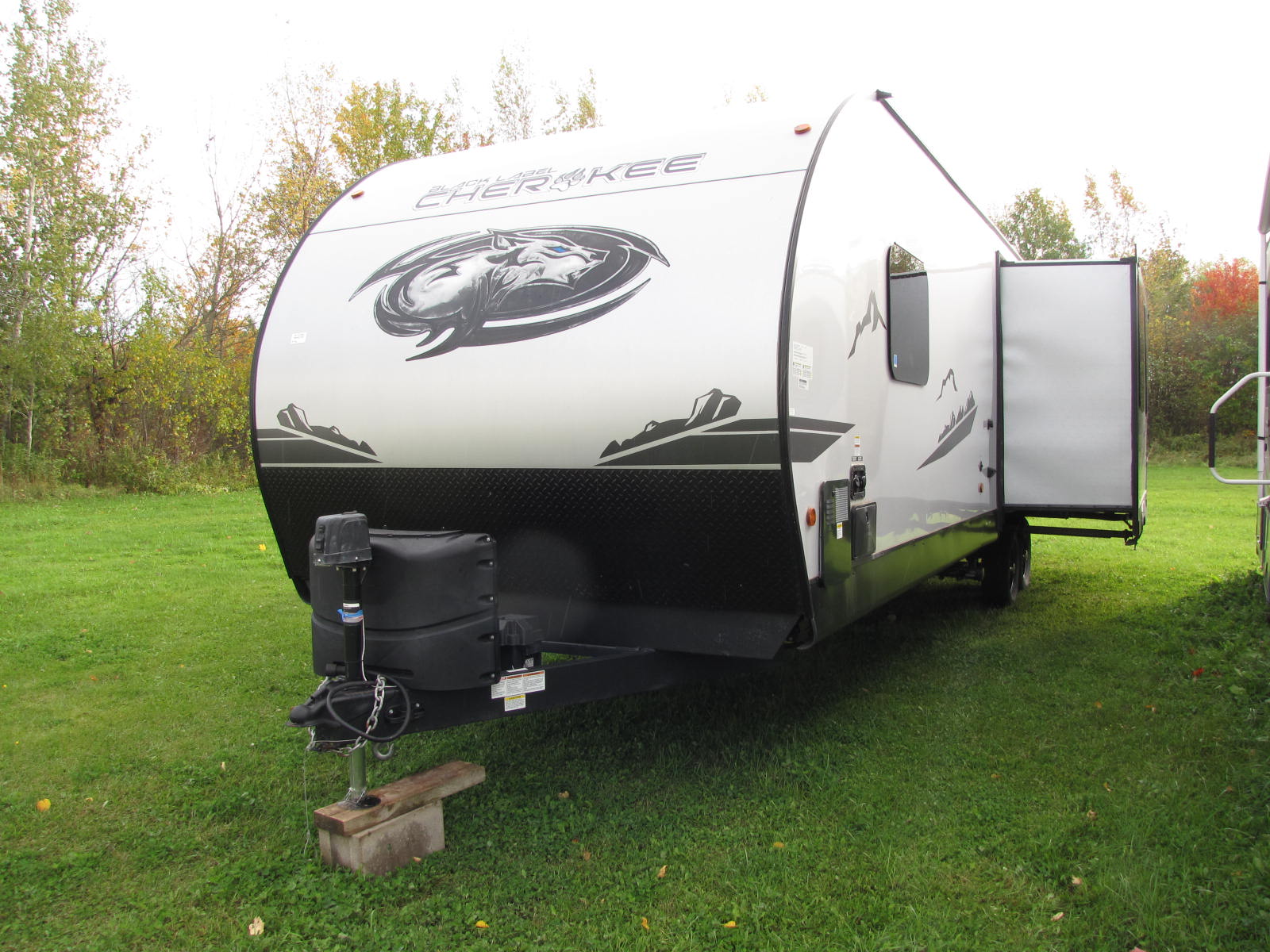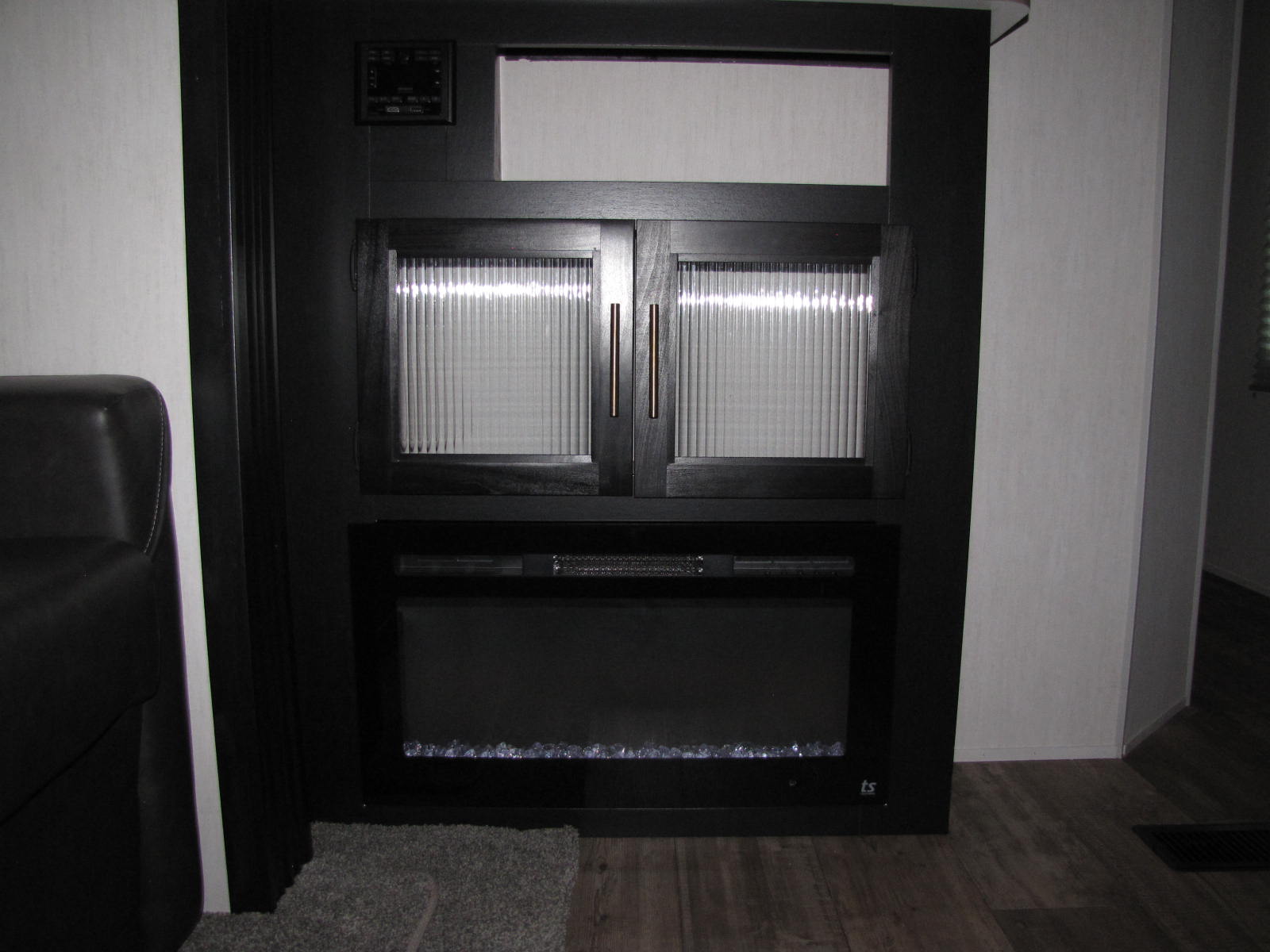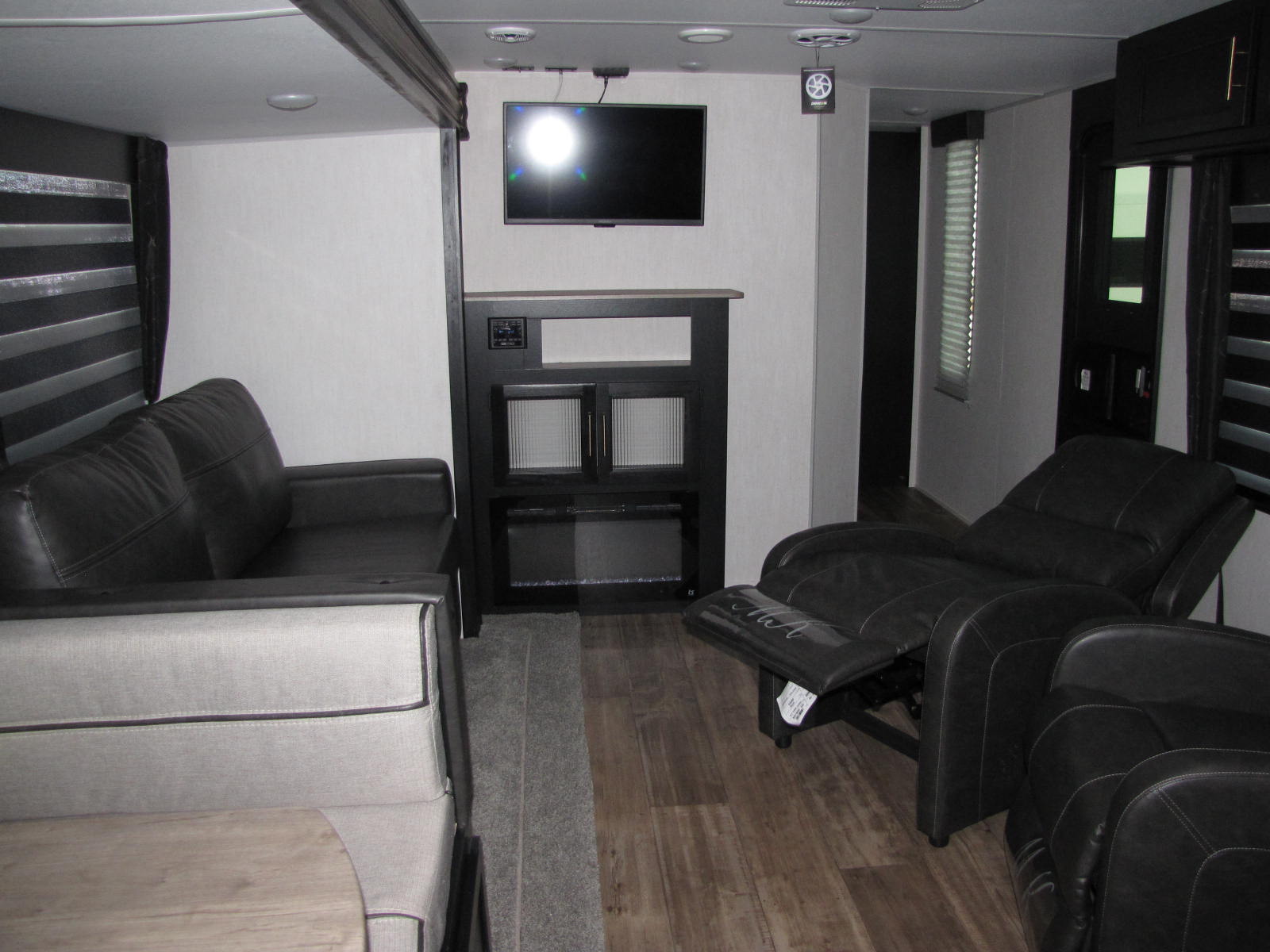 THIS IMMACULATE CAMPER WAS GENTLY USED FOR ONLY ONE SEASON. ONE SLIDE OUT, POWER AWNING, POWER JACKS AND BLACK OUT WINDOWS. THE NEVER USED OUTDOOR KITCHEN HAS AN ICE MAKER, A GRILL AND A SINGLE DOOR FRIDGE/FREEZER. THERE ARE QUALITY SOLID SURFACE COUNTER TOPS THROUGHOUT. FULLY EQUIPPED KITCHEN WITH A SKYLIGHT AND FULL CLOSET PANTRY. TWO RECLINING CHAIRS AND A FIREPLACE IN THE MAIN LIVING AREA. WILL SLEEP SIX WITH A FOLD OUT SOFA/SLEEPER, A FOLD DOWN DINETTE AND THE FRONT MAIN BEDROOM WITH AN ENSUITE ACCESS DOOR. THE DUAL ENTRANCE ENSUITE HAS A VANITY, NEO ANGLE SHOWER AND LINEN STORAGE. COME FOR A LOOK AND CALL RV PETE AT 506-260-2666 FOR MORE DETAILS. FINANCING OPTIONS AVAILABLE, O.A.C. WE ARE OPEN EVERYDAY TO BETTER SERVE YOU AND HAVE ZERO HIDDEN FEES!!!
