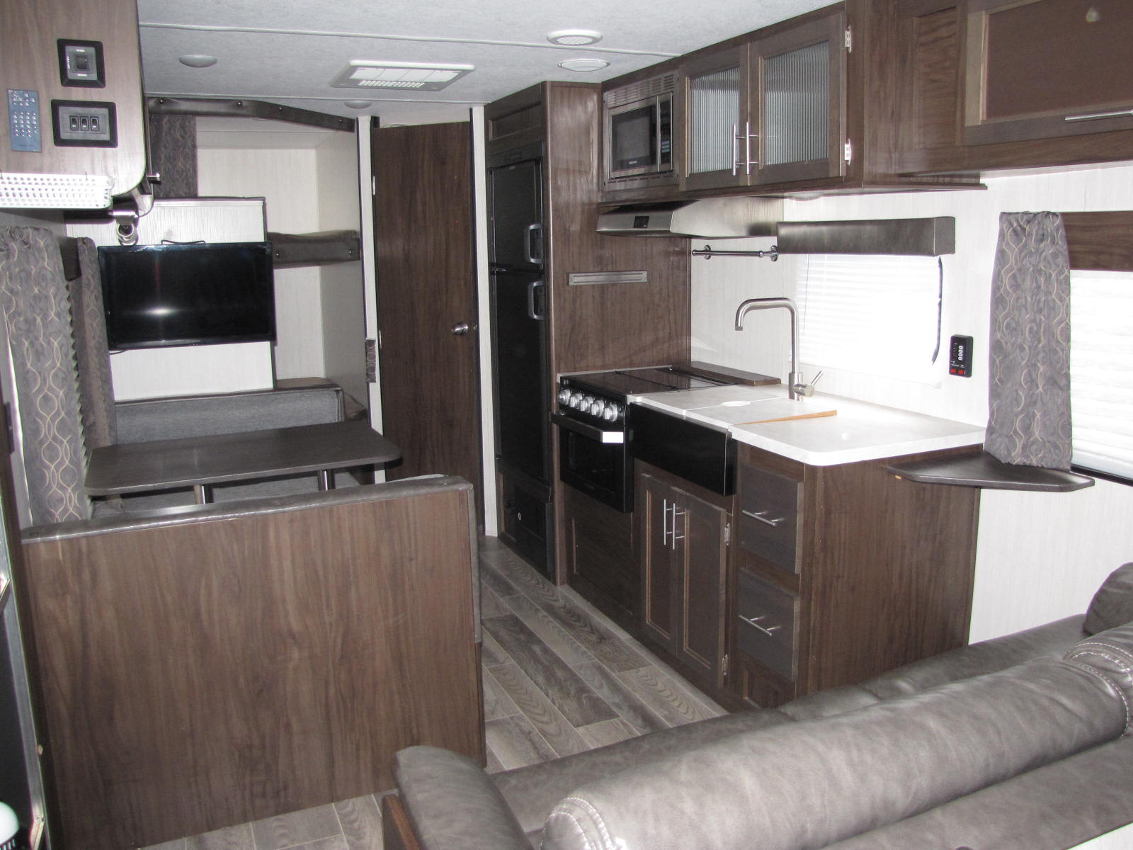 Price Drop!!! Was $34,900.00 Now ONLY $23,900.00!!! THIS FAMILY CAMPER HAS A U.V.W. OF ONLY 4510 POUNDS MAKING FOR AN EASY TOW. SOLAR READY WITH A POWER AWNING AND ELECTRIC TONGUE JACK. INSIDE HAS NO CARPETING AND QUALITY FABRIC WINDOW TREATMENTS. WILL SLEEP 10 PEOPLE WITH THE FRONT QUEEN MAIN BEDROOM, A JACK KNIFE SOFA, A FOLD DOWN DINETTE AND DOUBLE OVER DOUBLE BUNKS IN THE REAR. THE KITCHEN COMES FULLY EQUIPPED. IN THE ENSUITE IS A TUB/SHOWER AND LINEN STORAGE. COME FOR A LOOK AND CALL RV PETE FOR MORE DETAILS AT 506-260-2666. FINANCING OPTIONS AVAILABLE, O.A.C.
