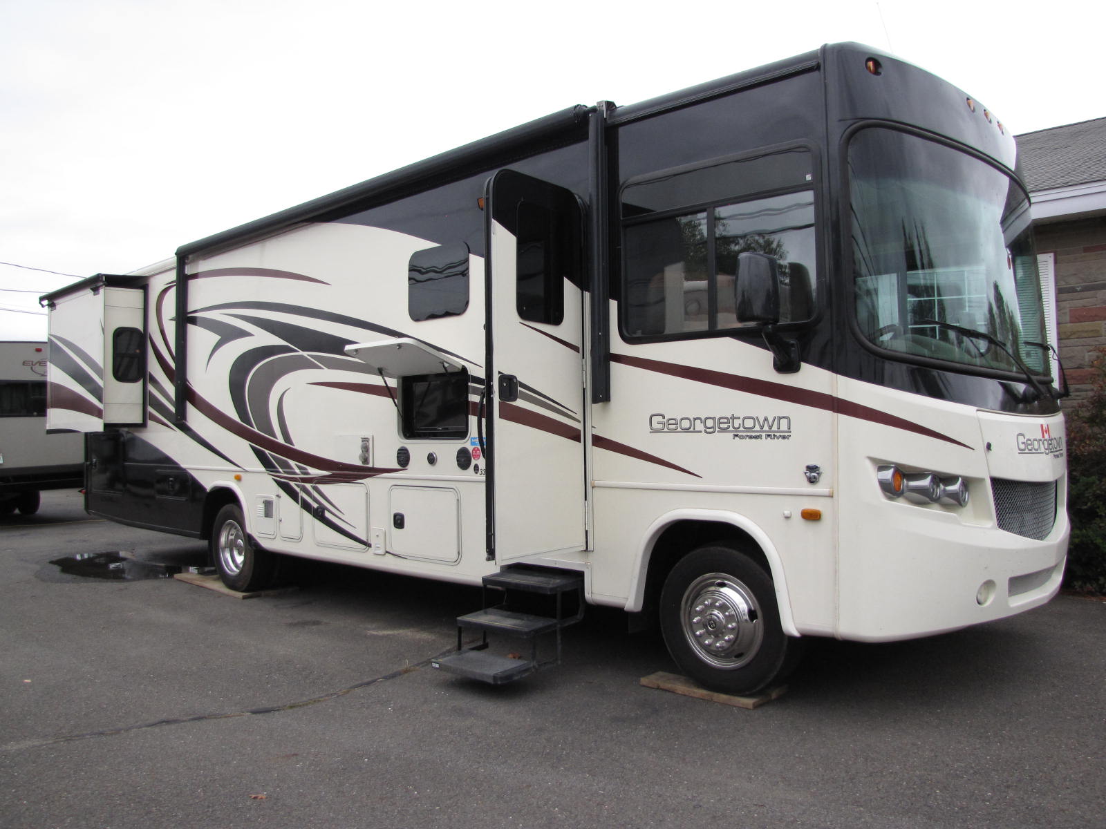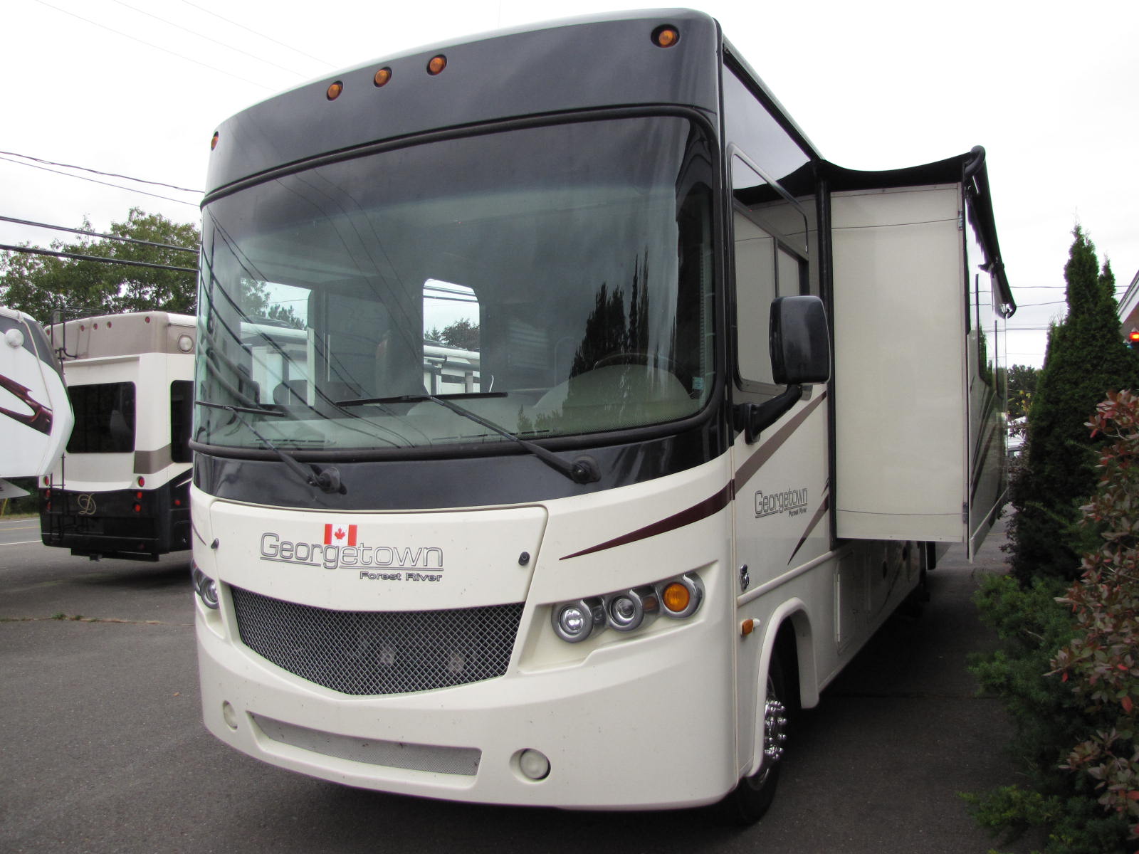 EXCELLENT CONDITION AND LOW KM ON THIS MADE BY FOREST RIVER, GEORGETOWN. RUNS A FOR V10 ENGINE. OUTDOOR ENTERTAINMENT CENTRE, POWER AWNING AND TWO SLIDE OUTS. INSIDE HAS NO CARPETS, QUALITY HARDWOOD CABINETRY THROUGHOUT AND FABRIC DAY/NIGHT SHADES. WILL SLEEP SEVEN WITH A SINGLE BUNK OVER THE CAB, A FOLD DOWN DINETTE, A JACK KNIFE SOFA/SLEEPER AND THE QUEEN MAIN SUITE IN THE BACK. THE FULLY EQUIPPED KITCHEN HAS QUALITY SOLID SURFACE COUNTER TOPS, CONVECTION/MICROWAVE OVEN AND A TWO DOOR FRIDGE/FREEZER WITH AN ICE MAKER AND PULL OUT BOTTOM FREEZER. RELAX IN FRONT OF YOUR FIREPLACE IN THE ENTERTAINMENT CENTRE. IN THE ENSUITE IS A CORNER GLASS SHOWER, VANITY AND LINEN STORAGE. CALL RV PETE FOR MORE DETAILS AT 506-260-2666. FINANCING OPTIONS AVAILABLE, O.A.C. WE ARE OPEN EVERYDAY TO BETTER SERVE YOU!
