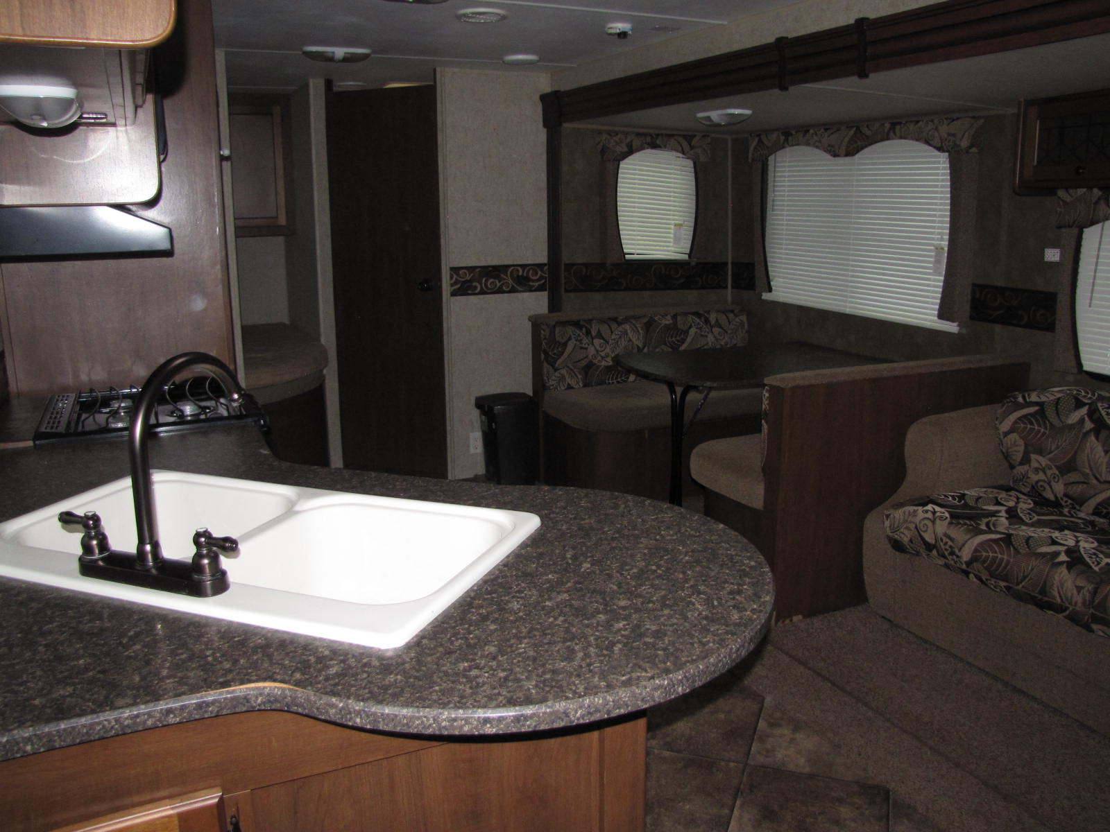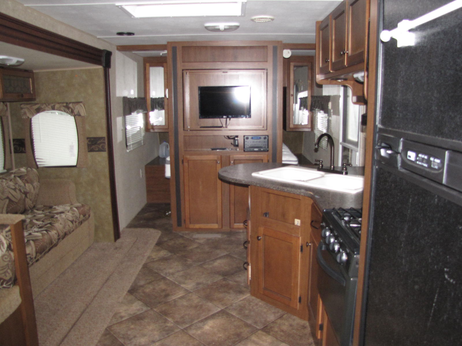 ONE SLIDE OUT, OUTDOOR AWNING AND A U.V.W. OF 6278 POUNDS. THE FULLY EQUIPPED KITCHEN HAS A PANTRY AND SKY LIGHT. IN THE ENTERTAINMENT CENTRE IS A TV THAT SPINS AROUND INTO THE MAIN BEDROOM. WILL SLEEP NINE WITH A FOLD DOWN DINETTE, A FLIP OUT SOFA SLEEPER, SINGLE OVER DOUBLE REAR BUNKS AND THE UP FRONT QUEEN MAIN BEDROOM. IN THE ENSUITE IS A TUB/SHOWER AND VANITY. COME FOR A LOOK AND CALL RV PETE FOR MORE DETAILS AT 506-260-2666. FINANCING OPTIONS AVAILABLE O.A.C. WE ARE OPEN EVERYDAY TO BETTER SERVE YOU AND HAVE ZERO HIDDEN FEES!!!
